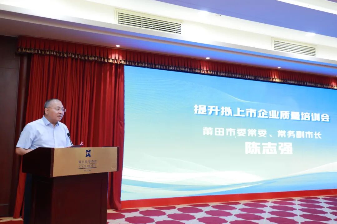 2024年5月8日,在福建证监局的指导下,由莆田市金融办、宁德市金融办、福建省证券期货业协会投行投资专业委员会、北京证券交易所华南基地联合主办,海峡股权交易中心承办的“提升拟上市企业质量培训会”在莆田市举办。莆田市委常委、常务副市长陈志强、宁德市政府副市长杨柳、福建证监局副局长翁国斌出席活动并致辞。